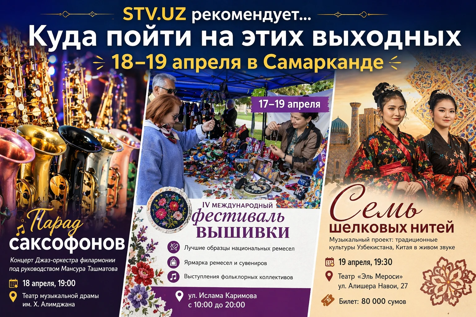 Если вы ещё не решили, чем заняться в ближайшие дни — Самарканд предлагает отличный выбор. Можно окунуться в мир ремесла, провести вечер под саксофон или открыть для себя музыку трёх древних культур. Главное — не сидеть дома.